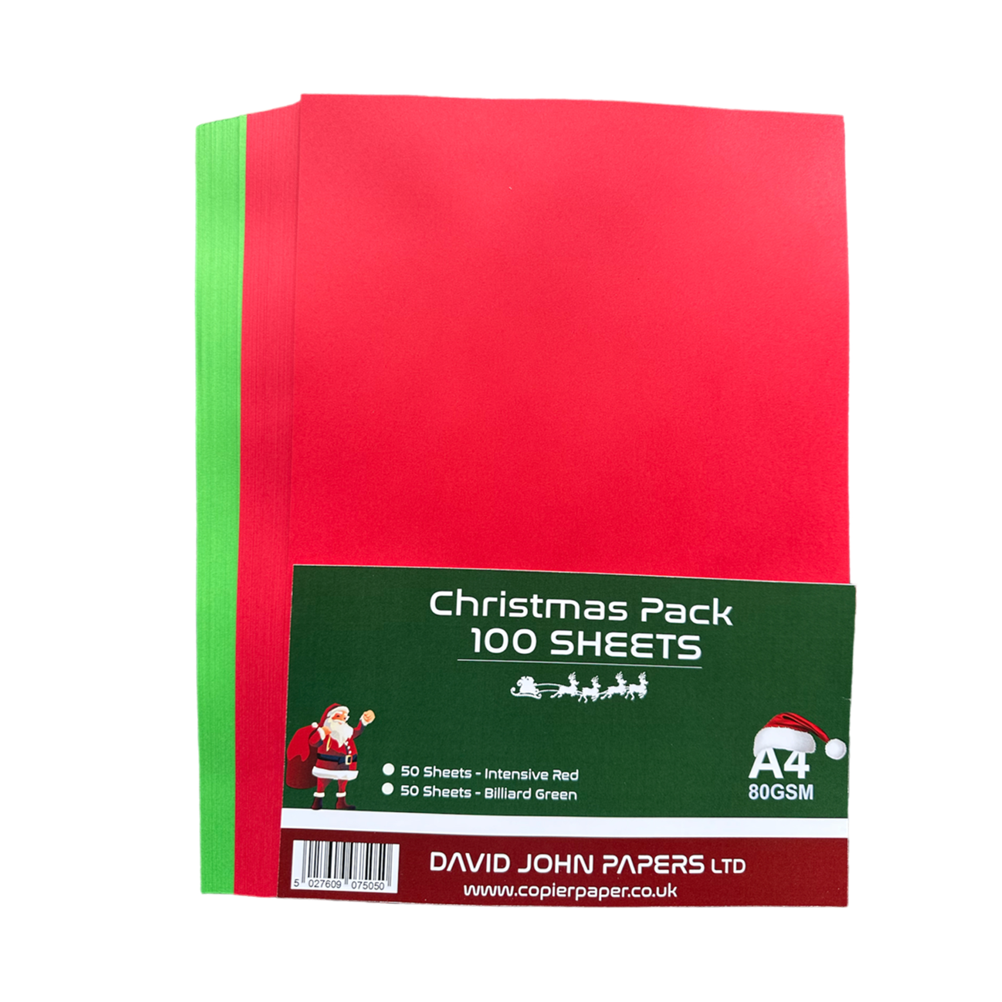 DJP A4 Christmas Coloured 80gsm Paper - Intensive Red & Billiard Green - 100 Sheets (50 Each Colour)